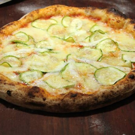 Molho de tomate da casa, mozzarela fior de latte, abobrinha italiana fatiada, marinada no sal e azeite, requeijão de corte Atalaia e parmesão