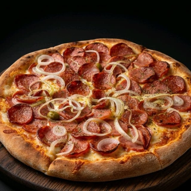 Fatias generosas de calabresa com cebola levemente dourada. Queijo derretido e massa macia. Simples, clássica e cheia de sabor.