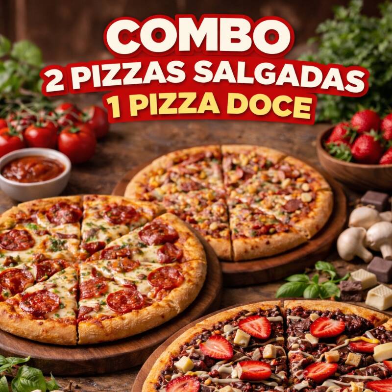 Duas pizzas salgada + 1 pizza doce, todas à sua escolha. Ideal para quem ama experimentar sabores intensos e finalizar com sobremesa irresistível. Massa artesanal, ingredientes selecionados e fartura garantida. Serve 3 a 5 pessoas. Obs: pizza 6 pdç 30cm cada.