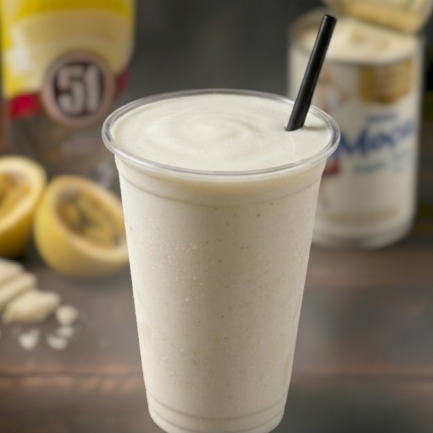 Batida Maracujá 700ml cremosa e gelada, com maracujá fresco e chocolate branco Lacta. Envio lacrada com suporte e canudo grosso.
