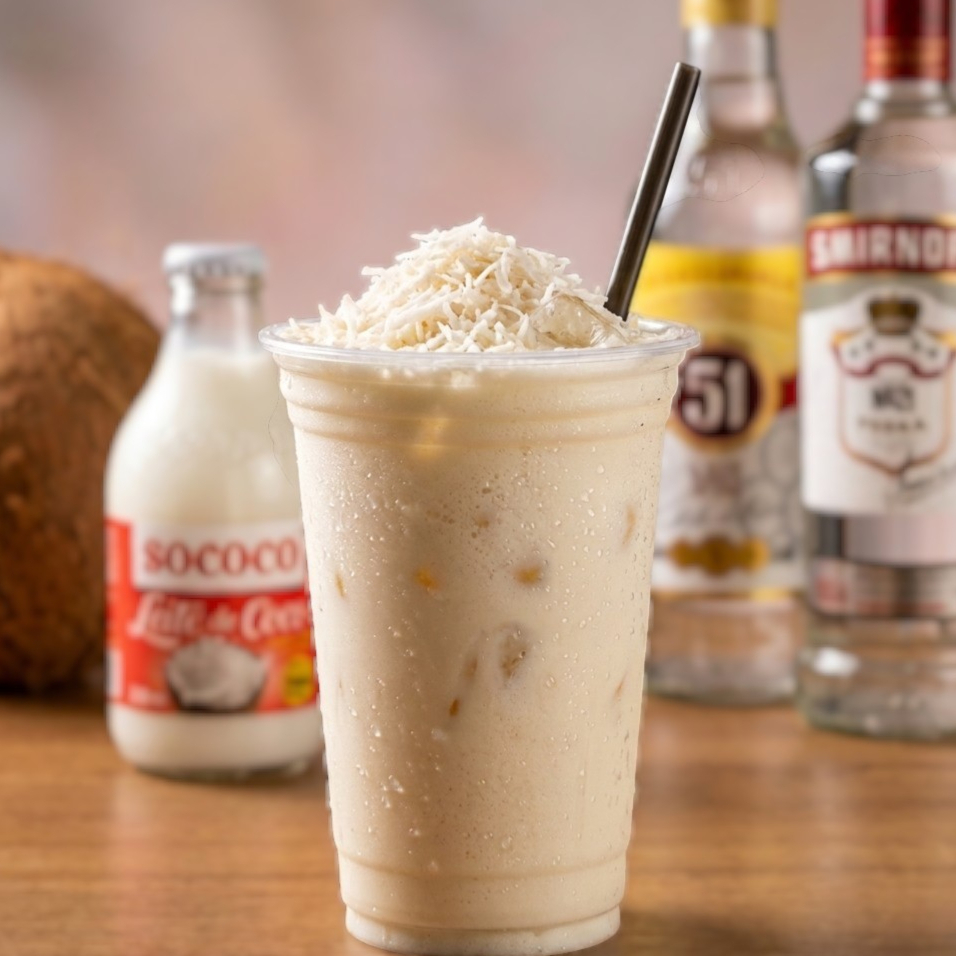 Batida de Coco 700ml cremosa e gelada, com coco ralado, leite de coco Sococo e leite condensado.