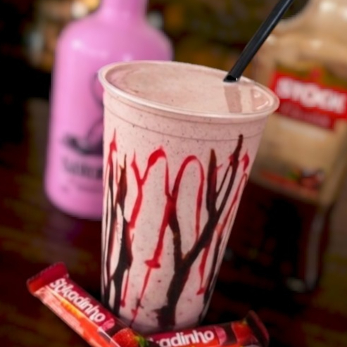 Sobremesa no copo super cremosa e gelada feita na hora com morangos licor de morango licor de chocolate leite condensado e creme de leite. Textura tipo milkshake bem encorpada finalizada com Stikadinho Doce intensa e viciante perfeita pra quem ama morango com chocolate