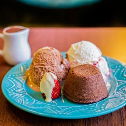 Um delicioso bolinho de chocolate com muita calda, acompanhado por dois sabores de gelato artesanal à sua escolha, calda de brigadeiro Belari e um morango.