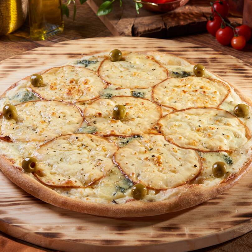Molho de tomate Italiano, muçarela, Catupiry, gorgonzola, provolone, orégano e azeitonas verdes sem caroço.