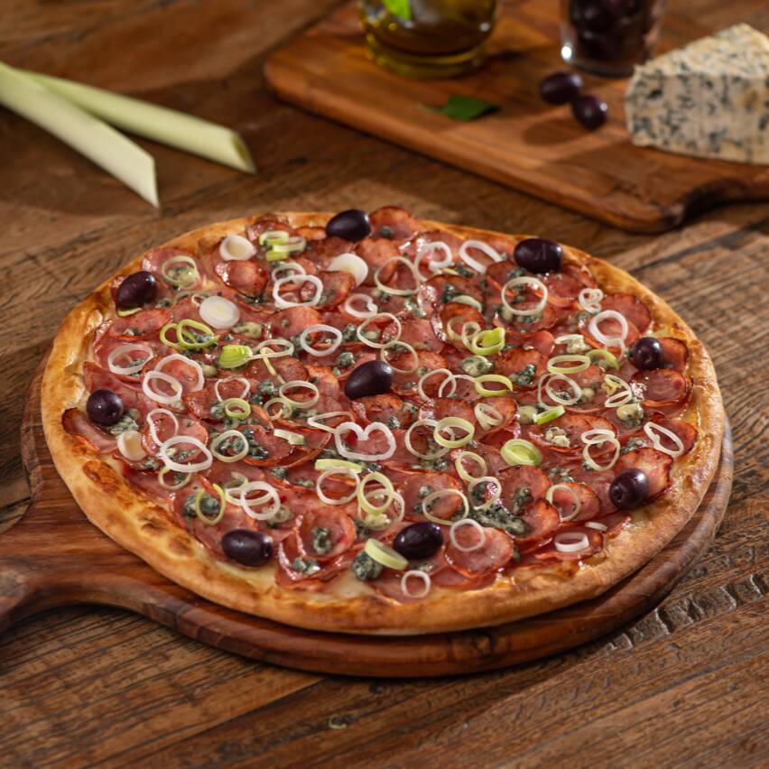 Molho de tomate Italiano, muçarela, calabresa premium, gorgonzola, alho-poró, orégano e azeitonas pretas.