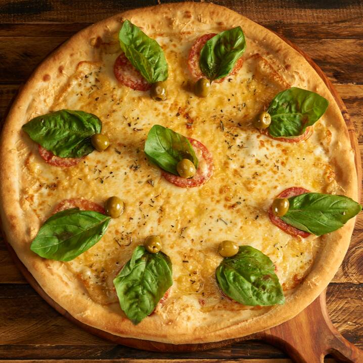 Molho de tomate Italiano, muçarela, tomate, parmesão, orégano, manjericão e azeitonas verdes sem caroço.