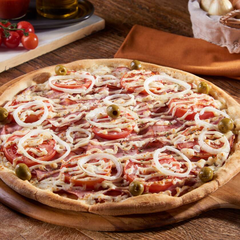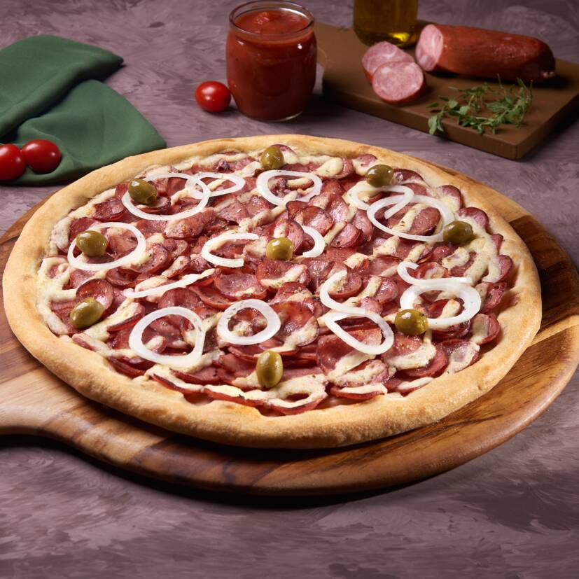 Molho de tomate Italiano, muçarela, calabresa premium, cebola, orégano e azeitonas verdes sem caroço.