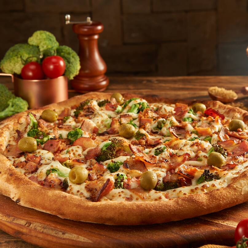 Molho de tomate Italiano, presunto, brócolis, requeijão, bacon em cubos, orégano, alho frito e azeitonas verdes sem caroço.