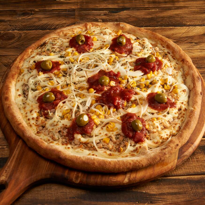 Molho de tomate Italiano, frango, requeijão, milho, cebola, orégano e azeitonas verdes sem caroço.