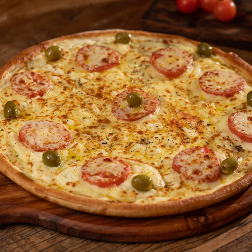 Molho de tomate Italiano, tomate, requeijão, muçarela, orégano e azeitonas verdes sem caroço.