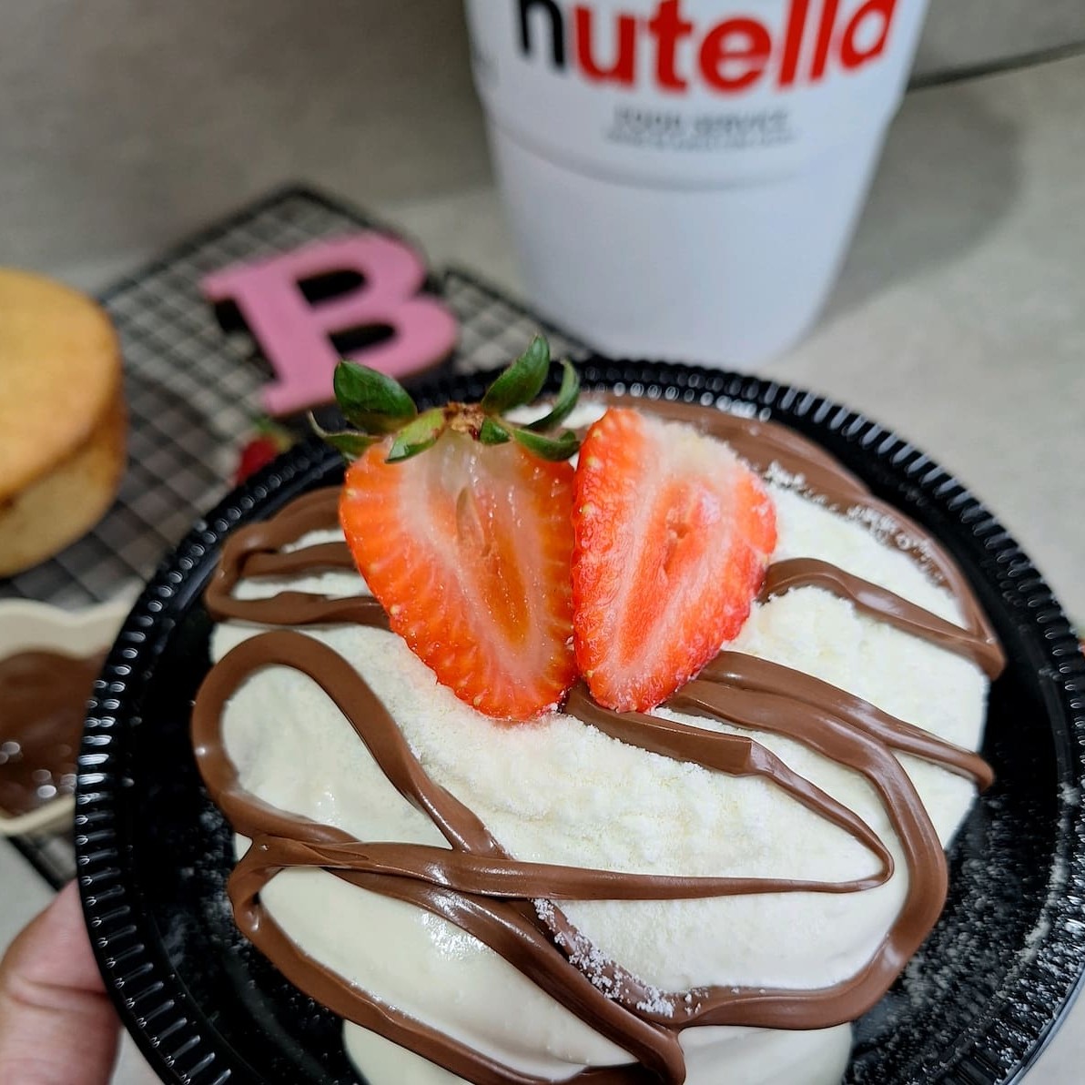 Nossa deliciosa opção de mini bolo de massa chocolate com cobertura de Ninho e riscos de Nutella finalizado c morangos !