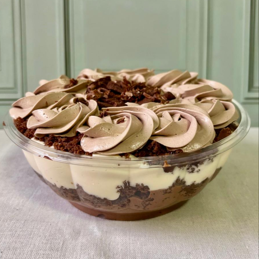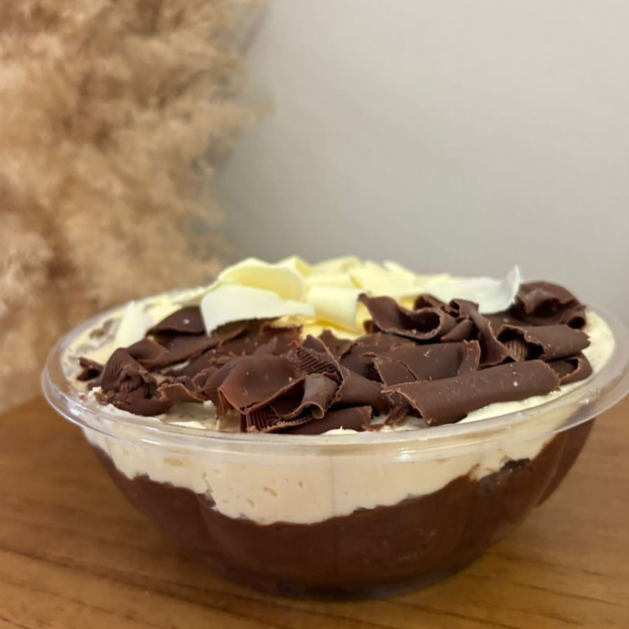 Nossa opção deliciosa de mousse branca trufada e mousse de chocolate finalizada com raspas !Serve ate 6 de 1 litro