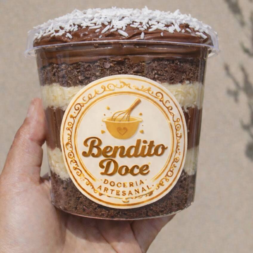Deliciosa camada de bolo molhadinho, com camadas intercaladas de recheio brigadeiro de ninho e brigadeiro com coco fresco. Pote de 250ml