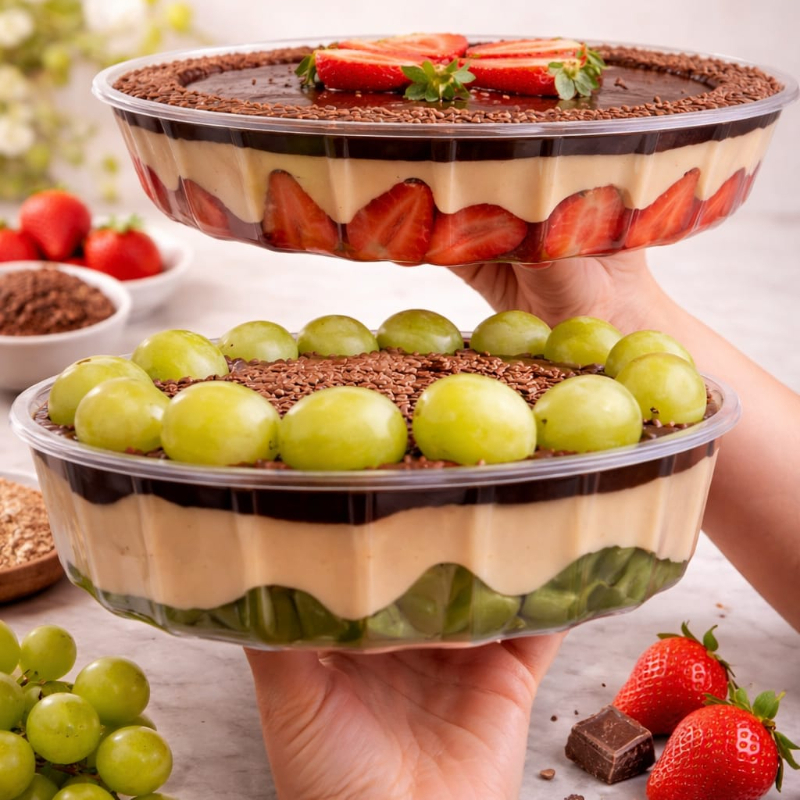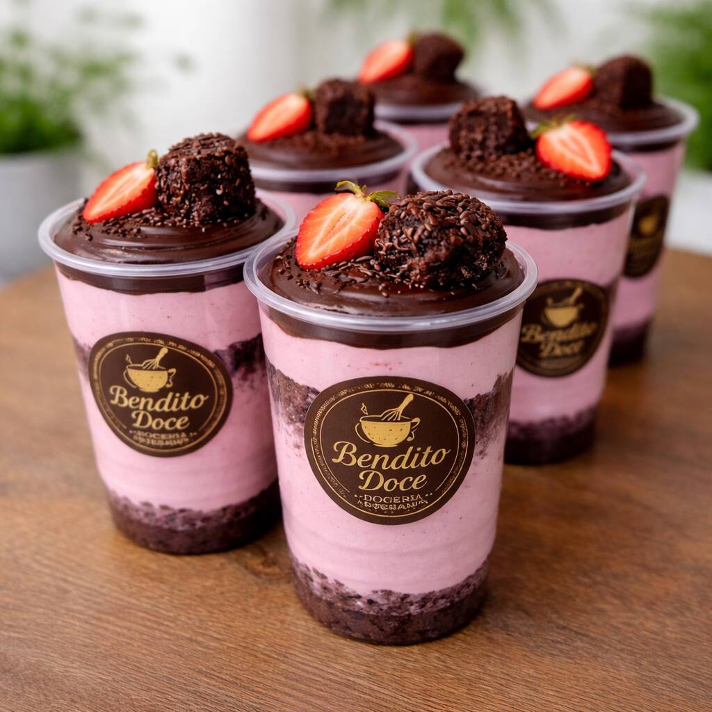 Copo de 300ml com recheio em camadas de bolo de chocolate, brigadeiro e mousse de morango..
