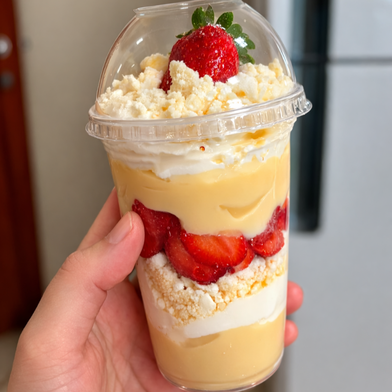 Copo de 300ml com camadas intercaladas de morango, suspiros triturados, chantilly e brigadeiro de ninho