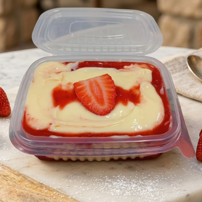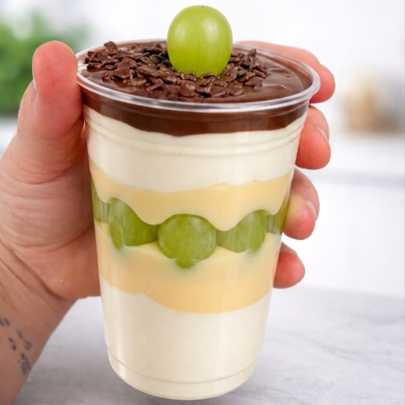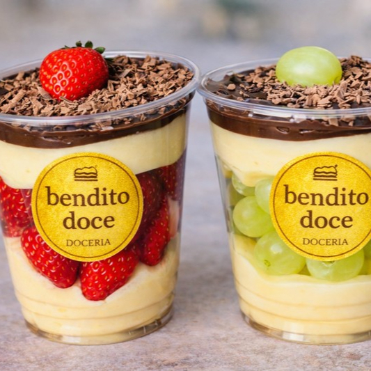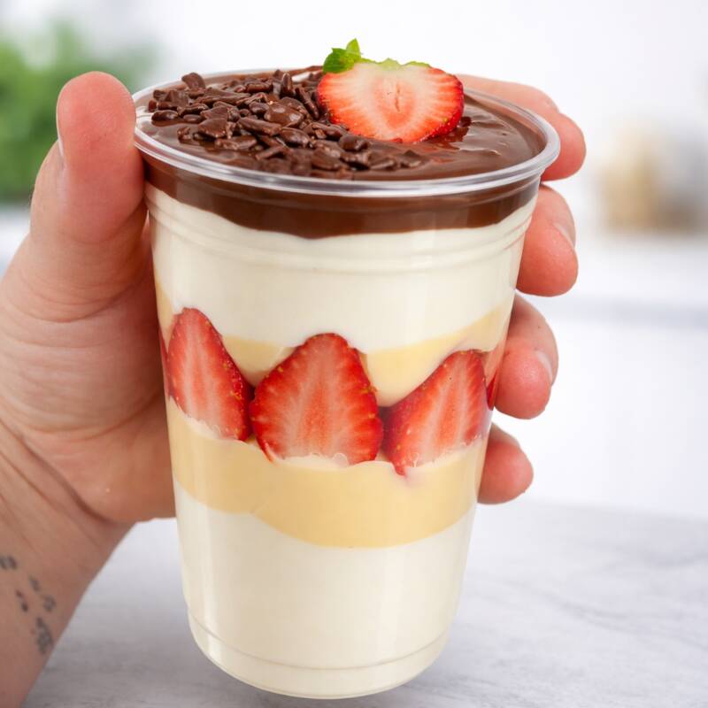 Copo de 300ml com camadas de creme de ninho e morangos frescos, finalizado com ganache meio amargo para balancear o sabor.
