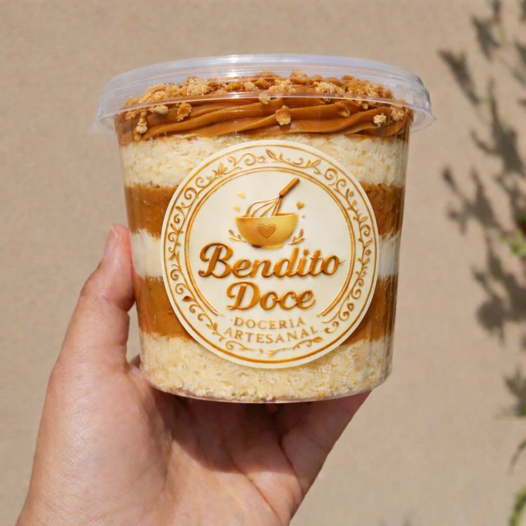Deliciosa camada de bolo molhadinho, com camadas intercaladas de recheio de doce de leite e paçoca. Pote de 250ml
