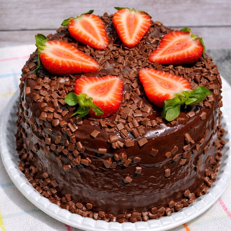Bolo vulcão com massa fofinha de chocolate coberto com um delicioso brigadeiro e morangos frescos para decorar