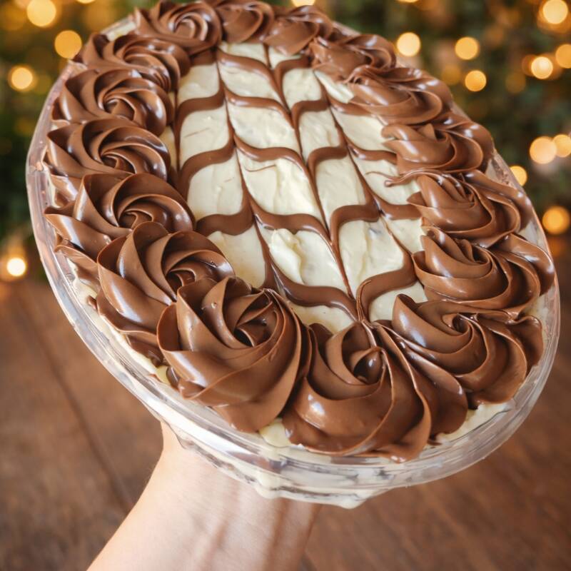 Pavê com camadas de brigadeiro ferreiro, bolachas Maria e finalizado com nutella