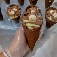 Cascão de sorvete banhado no chocolate, com recheio de ninho e camadas de creme de ovomaltine. Para delivery todos os cones vão fechados com chocolate e pode variar na decoração