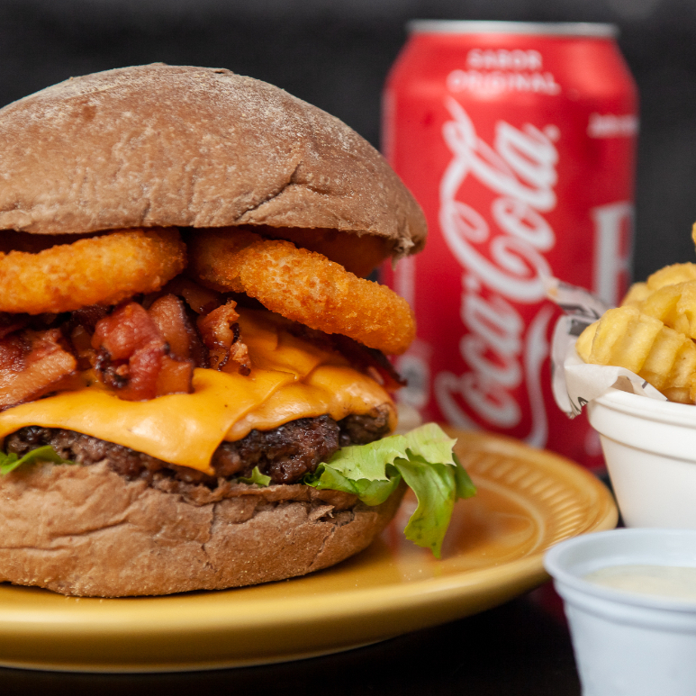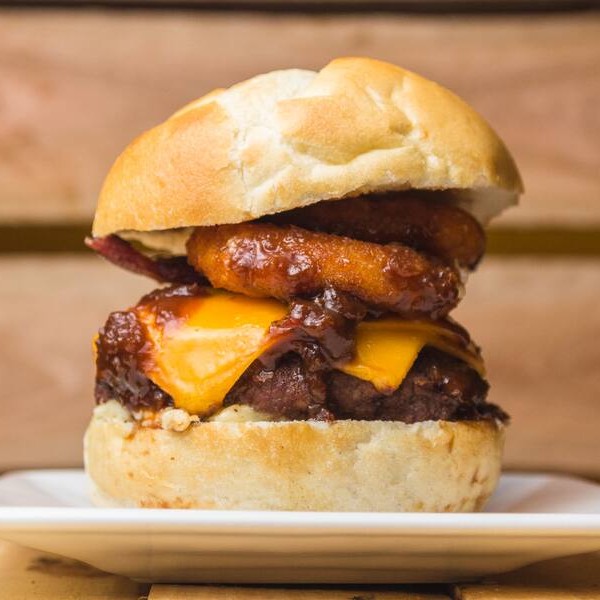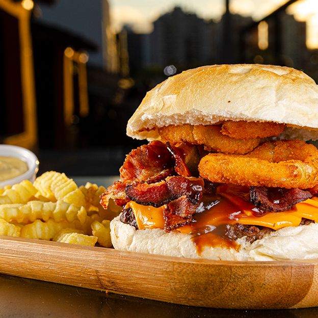 Pão, maionese da casa, 160g de carne, queijo cheddar, bacon, anéis decebola e barbecue