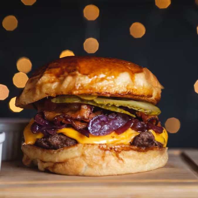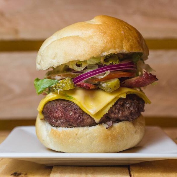 160g de Burger, pão, maionese da casa, queijo cheddar, cebola caramelizada, bacon e picles
