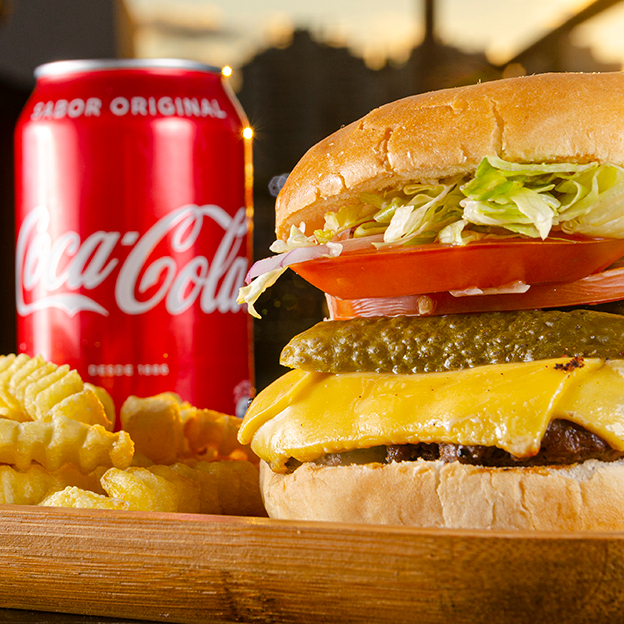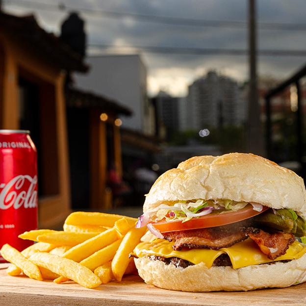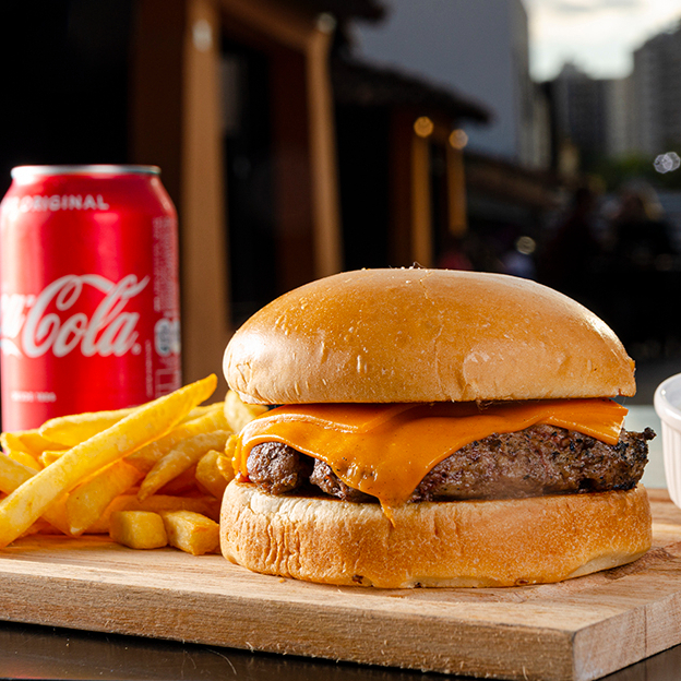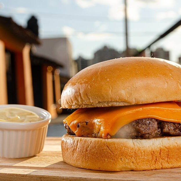 Pão, 160g de carne, queijo cheddar e maionese da casa.