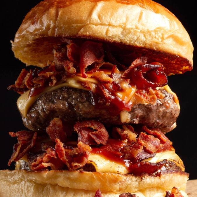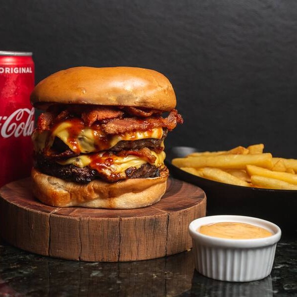 Pão tradicional, maionese da casa, duas carnes de 160g, queijo prato, bacon e barbecue)