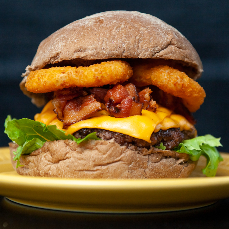 Pão, maionese da casa, 160g de carne , queijo cheddar, bacon, anéis decebola e barbecue