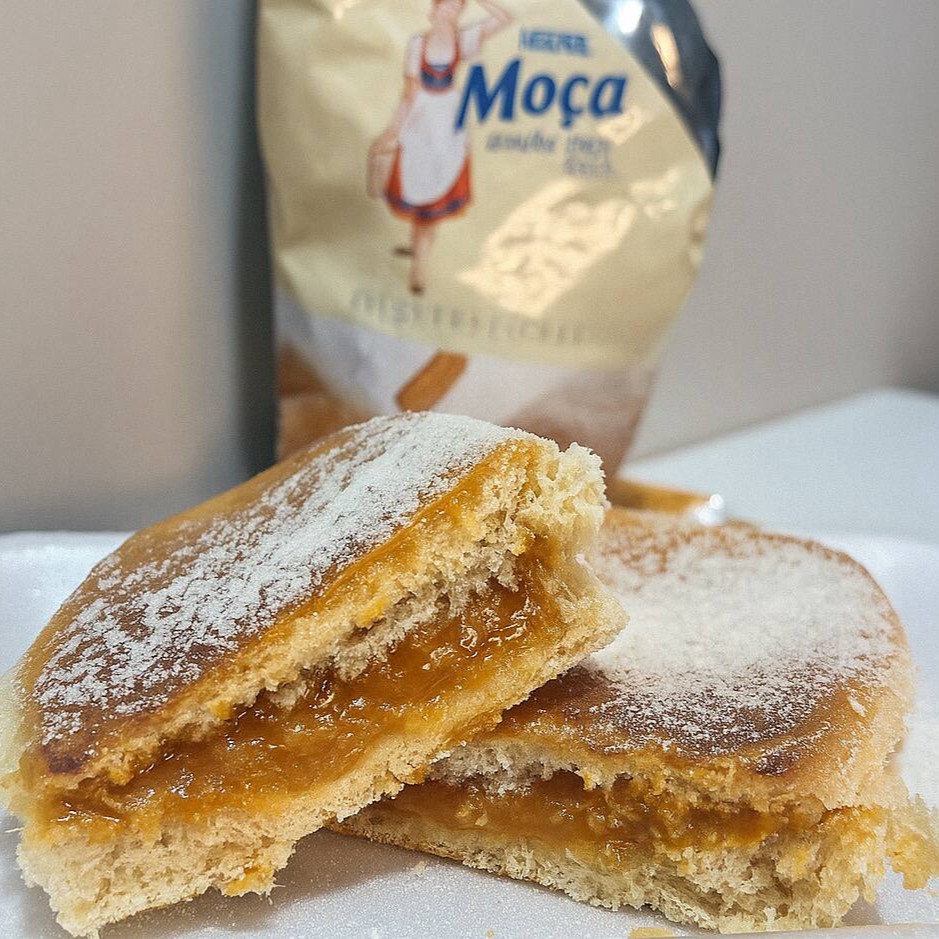 Berna Moça Pão na chapa, recheado com doce de leite cremoso e um toque especial de leite Ninho. Clássico, doce e nostálgico.