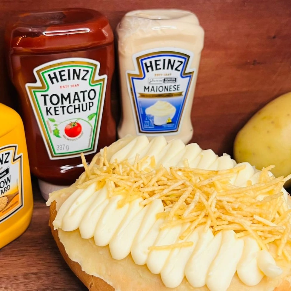Pão, Salsicha Sadia, Maionese, Ketchup, Mostarda, Milho, Vinagrete, Purê 100% Caseiro, Batata Palha e Cream Cheease da Catupiry