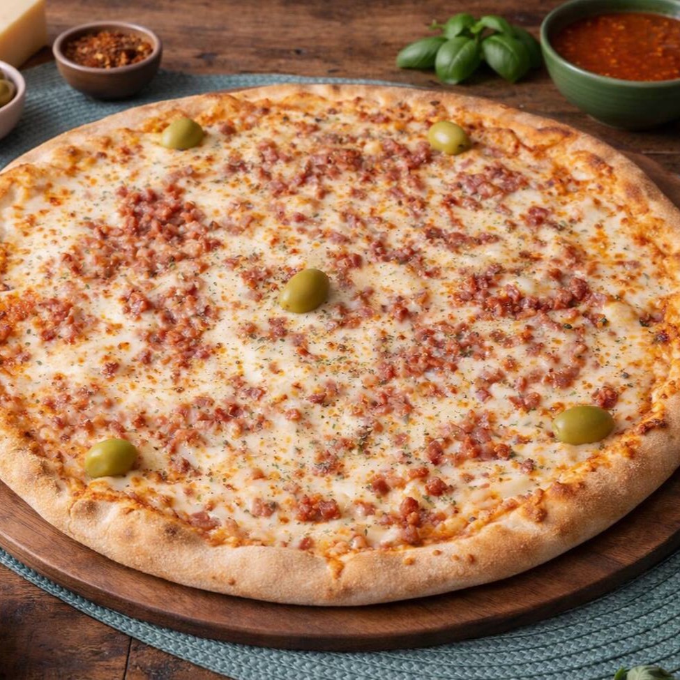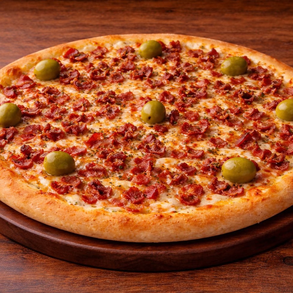 Bacon crocante combinado com mussarela derretida, sobre molho caseiro, finalizada com orégano e azeitonas, em massa macia e assada no ponto certo.