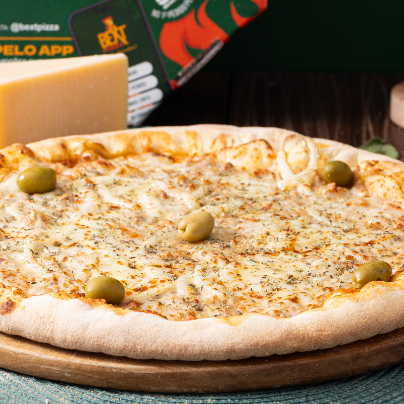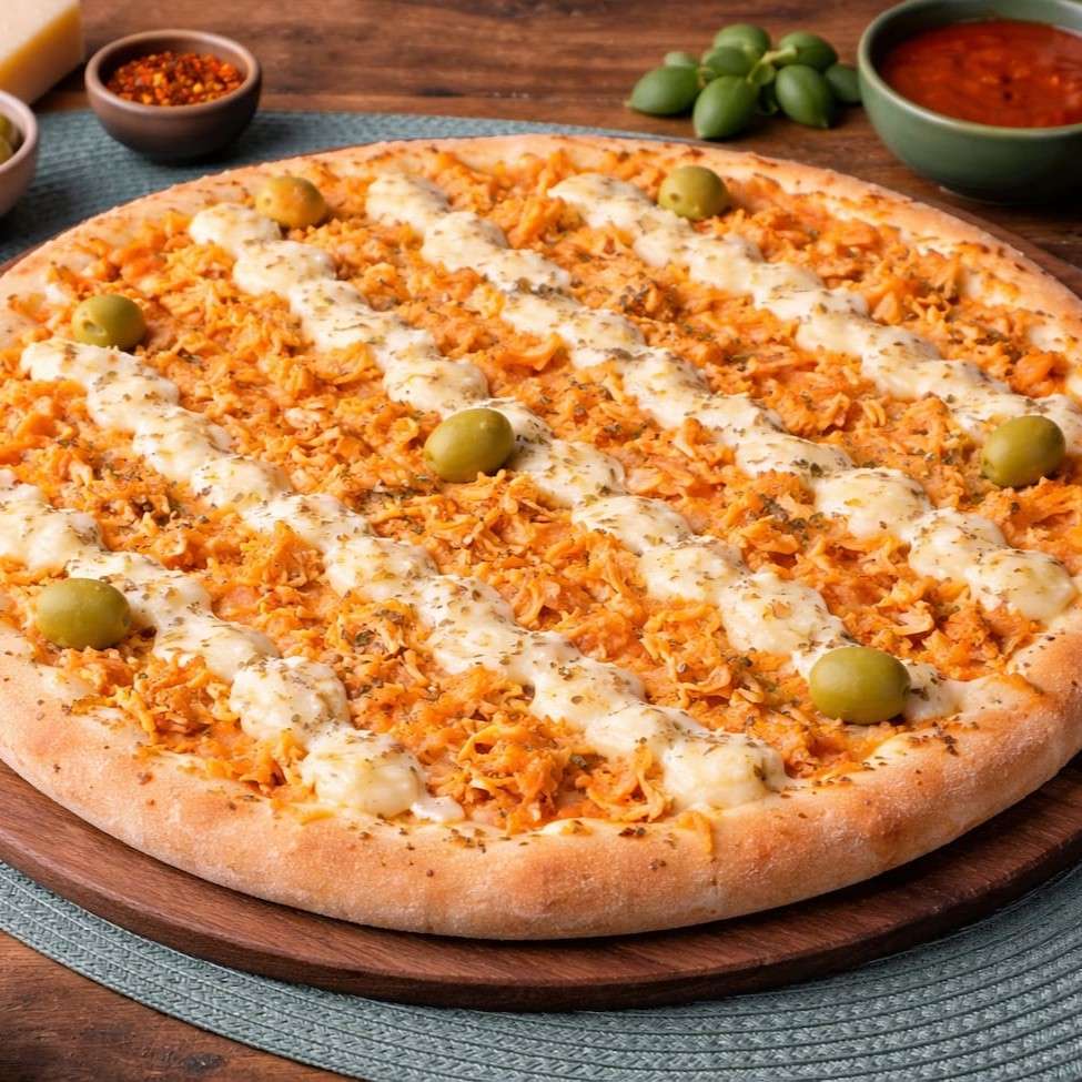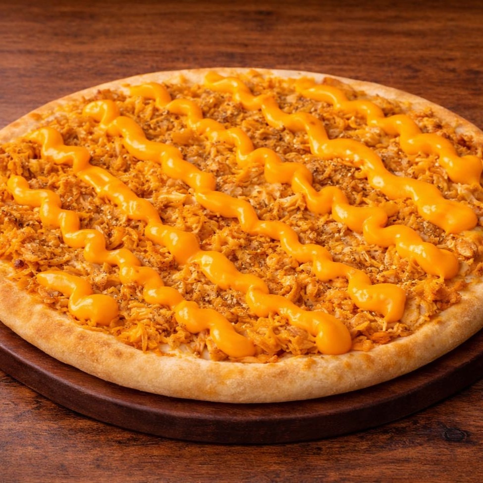 Frango desfiado bem temperado, combinado com requeijão cremoso e suave, formando uma pizza extremamente macia, cremosa e equilibrada, com sabor marcante e textura que derrete a cada pedaço.