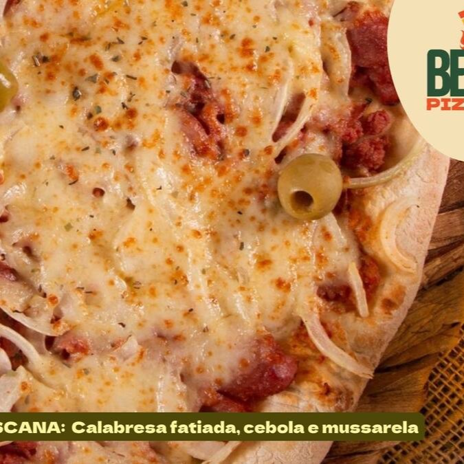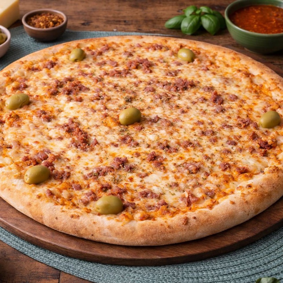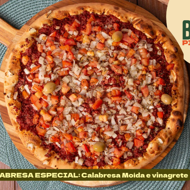 Molho de tomate artesanal, calabresa moída bem temperada, cebola fatiada e leve toque de molho de pimenta, finalizada com orégano e azeitonas sobre massa macia e assada no ponto certo.