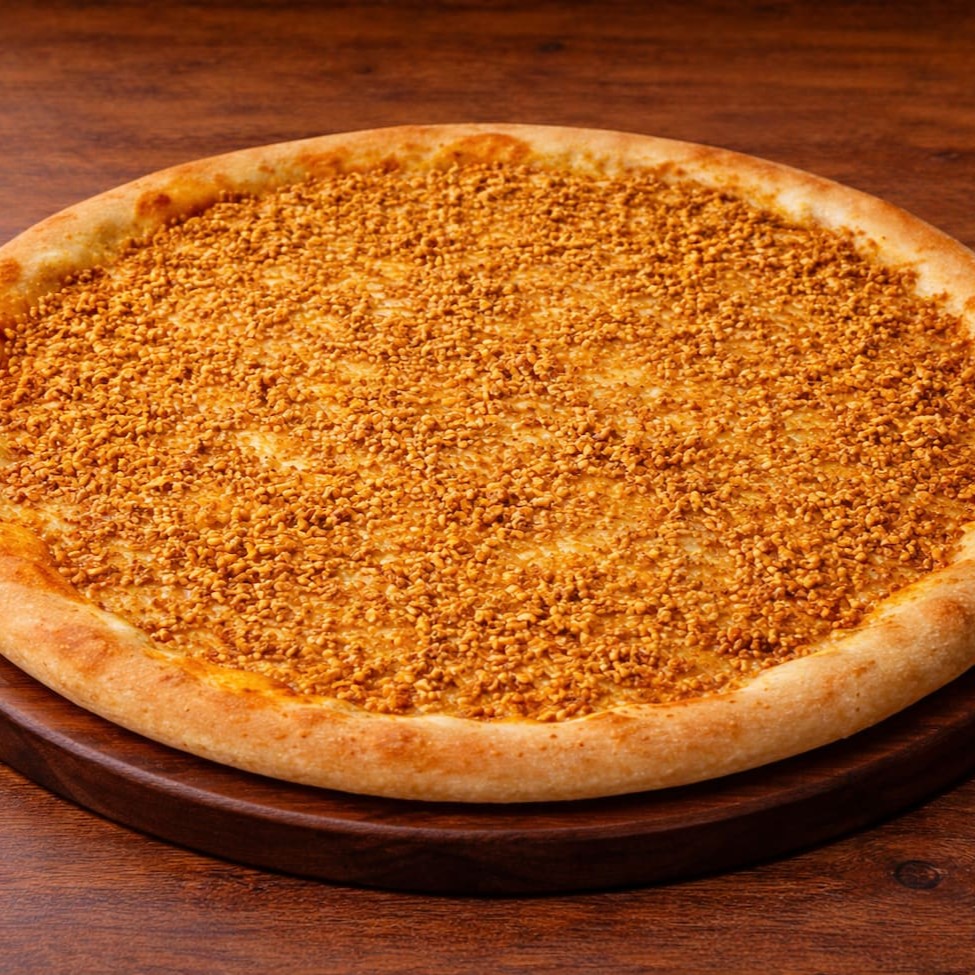 Mussarela derretida combinada com alho frito crocante, sobre massa macia e assada no ponto certo.