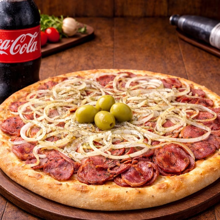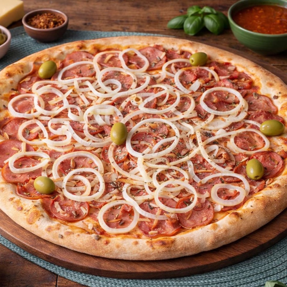 Generosas fatias de calabresa combinadas com cebolas frescas e uma camada irresistível de mussarela derretida.