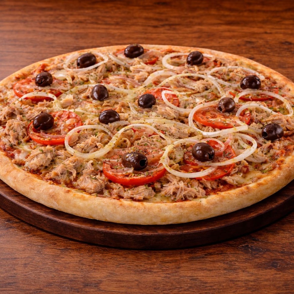 Atum ralado combinado com cebola fatiada e tomate, sobre molho caseiro, finalizada com orégano e azeitonas, em massa macia e assada no ponto certo.