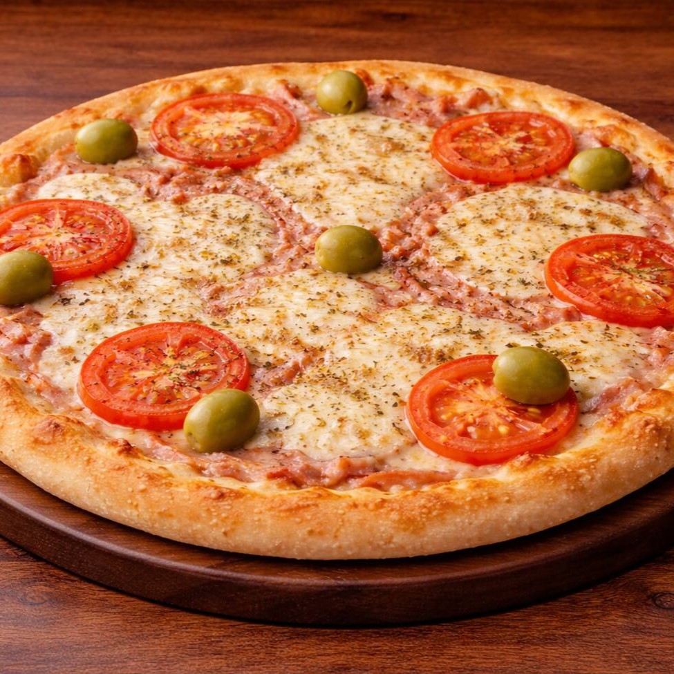 Molho de tomate artesanal, mussarela fatiada e derretida, presunto ralado e rodelas frescas de tomate, finalizada com orégano e azeitonas, sobre massa macia e assada no ponto certo.
