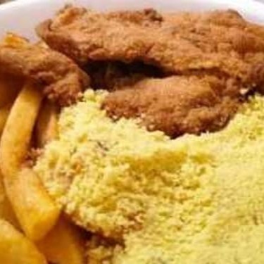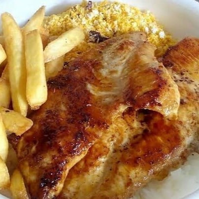 File de Frango Grelhado, Acompanhado de Arroz, Feijão, Batata Frita e Farofa.