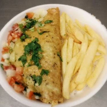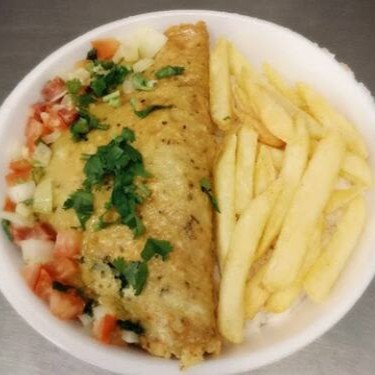 Omelete Recheado com Mussarela e Tomate. Acompanhado de Arroz, Feijão, Batata Frita e Farofa.