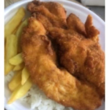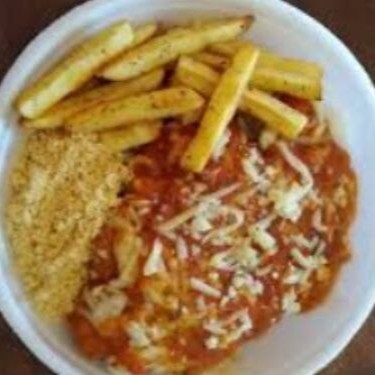 Parmegiana de Frango, Acompanhado de Arroz, Feijão, Batata Frita e Farofa.