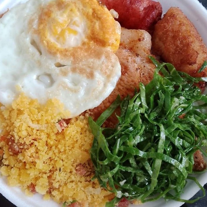 Arroz, Tutu de Feijão, Bisteca Suína Grelhada, Couve Refogada, Banana Frita, Linguiça Frita, Ovo Frito.
