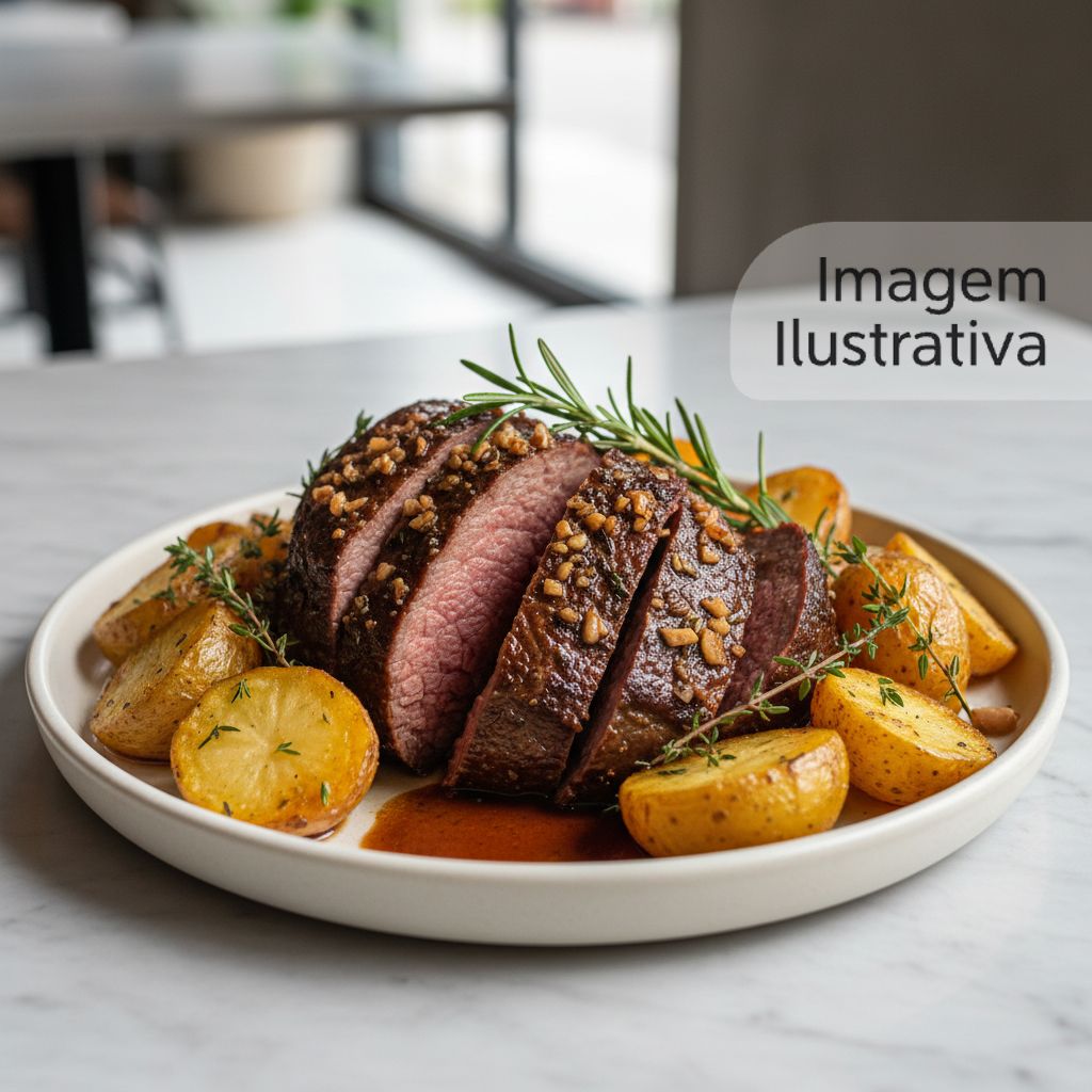 Maminha assada lentamente, marinada em ervas finas, acompanhada de arroz e batata rústica.