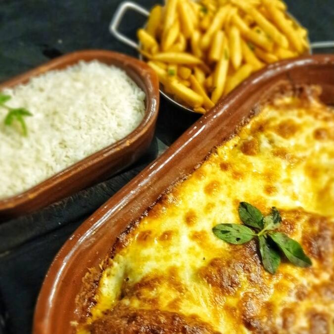600g de filé mignon à milanesa, com molho de tomate e queijo. Acompanha arroz e fritas