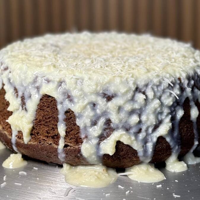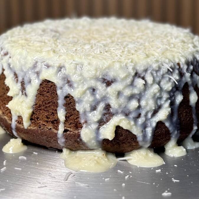 Chocolate por dentro, coco por fora. Um espetáculo em camadas. Massa de chocolate fofinha com o centro recheado com brigadeiro de verdade — denso, brilhoso e bem recheado. Por cima e nas bordas, uma cobertura generosa de beijinho cremoso com coco ralado. É o Prestígio em versão bolo, e com presença de palco. Se chocolate e coco é o casal perfeito, esse aqui é de aliança no dedo. Aproximadamente 600g, rende cerca de 08 à 10 fatias.