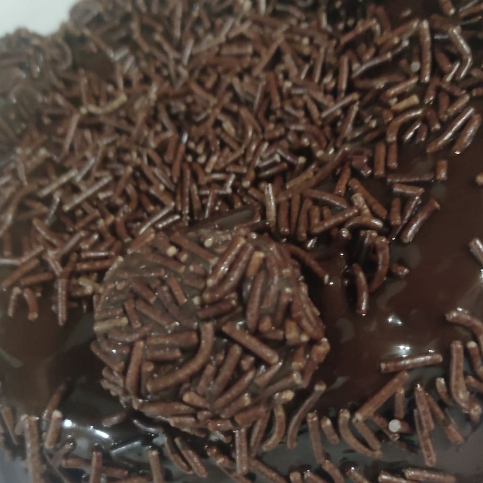 Massa de chocolate cobertura com brigadeiro cremoso , decorado com granulado e brigadeiro