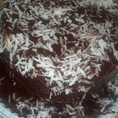 Massa de chocolate ,recheado ao centro com Prestígio coberto com brigadeiro cremoso e decorado com granulado e coco em flocos