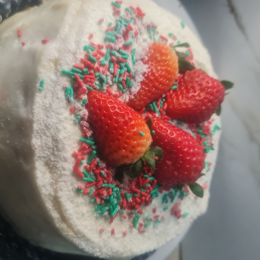 Massa de ninho , recheio ao centro do bolo com creme de ninho e morango frescos picados, coberto com creme de ninho decorado com morangos e granulado natalino