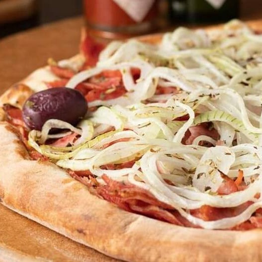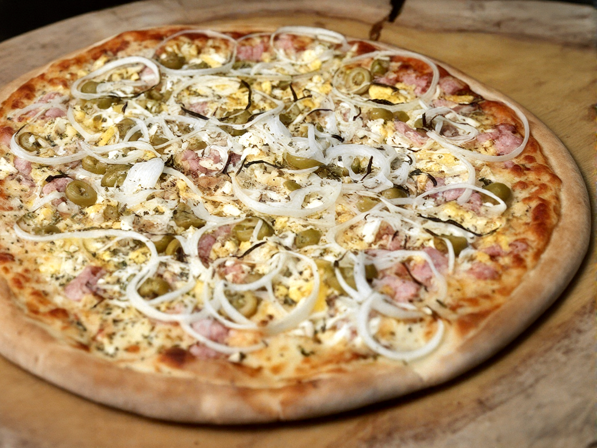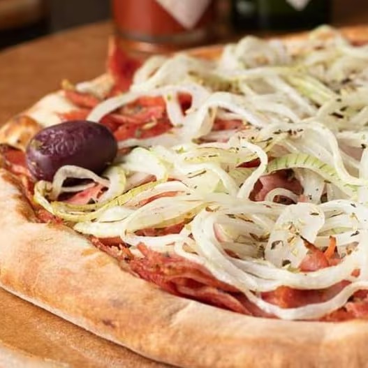 Pizza Grande (35cm) 8 Pedaços - Delicioso recheio de calabresa, cebola, molho de tomate, orégano e azeitonas.