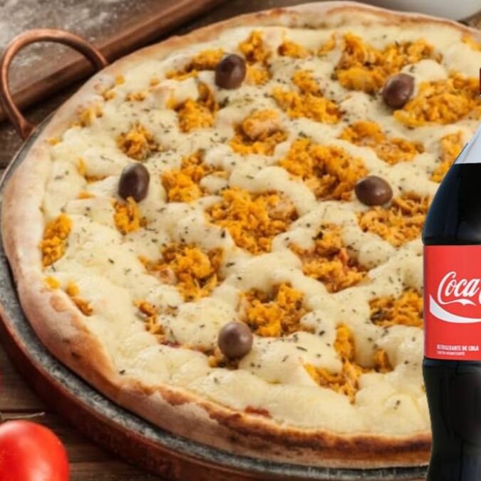 Promoção Pizza Grande (35cm) - Delicioso recheio de frango, Catupiry Original, molho de tomate, orégano e azeitonas + 1 Coca-Cola 2 Litros.